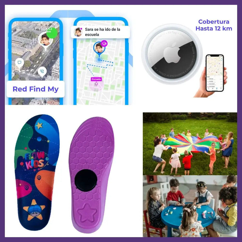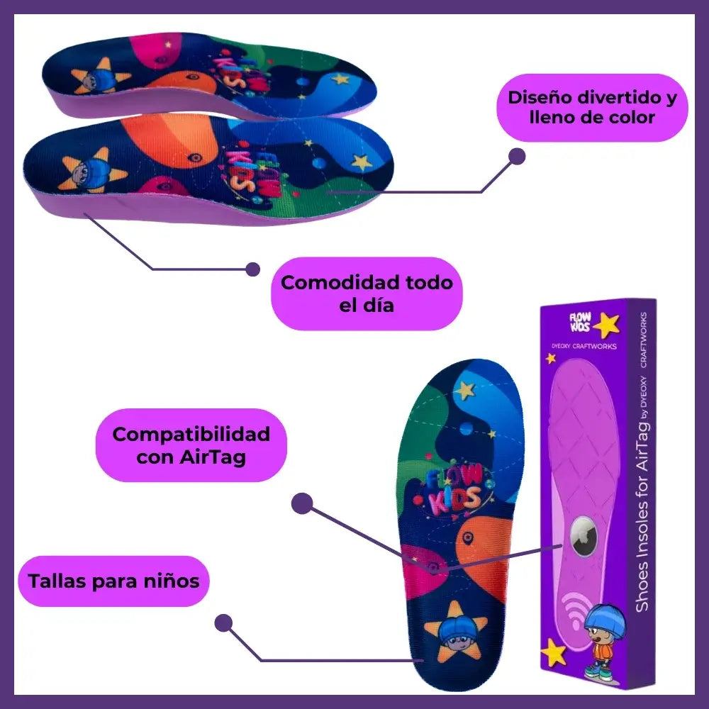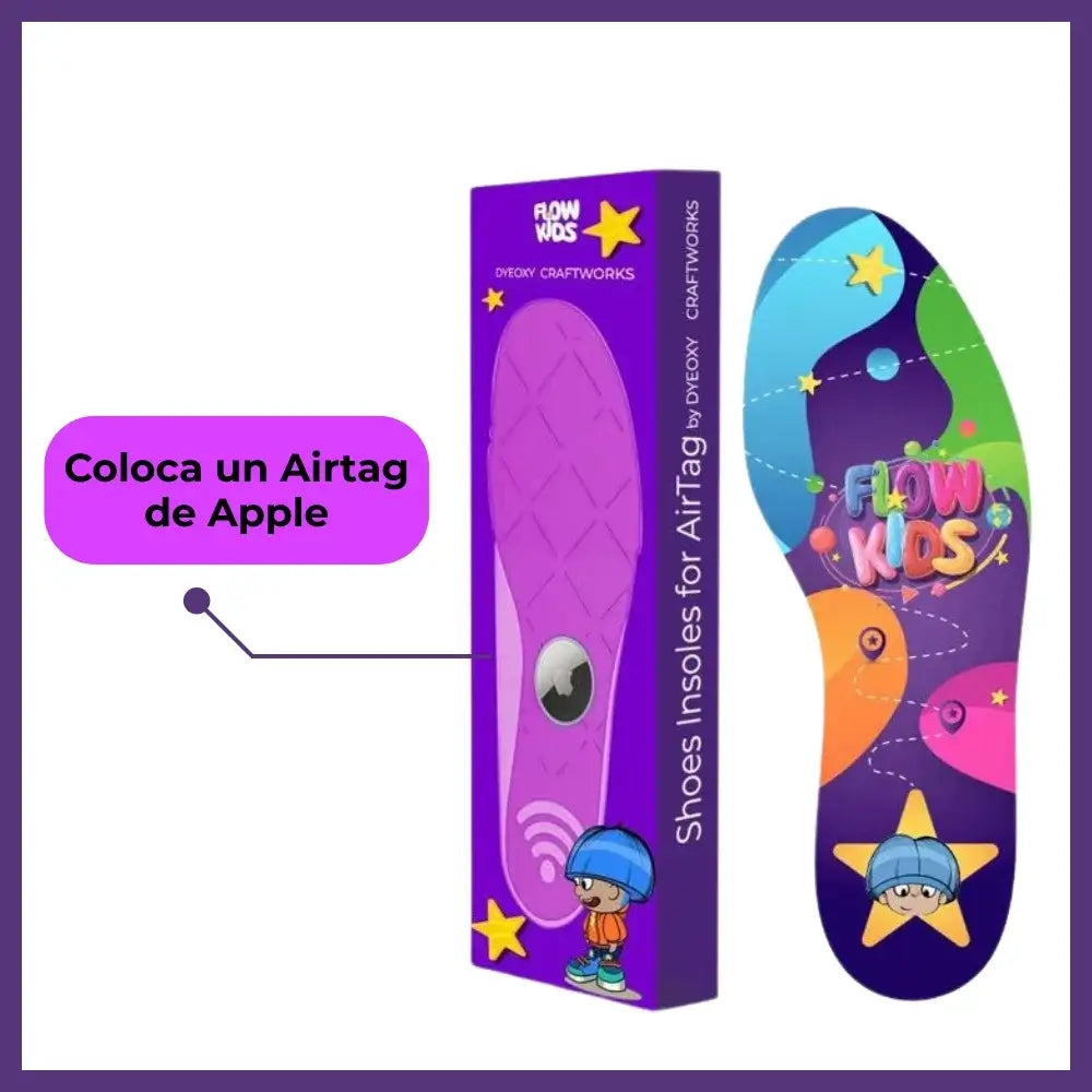 Presentamos nuestras coloridas plantillas Flow Kids, diseñadas especialmente para colocar un AirTag de Apple de forma segura y discreta dentro del zapato de tu pequeño.